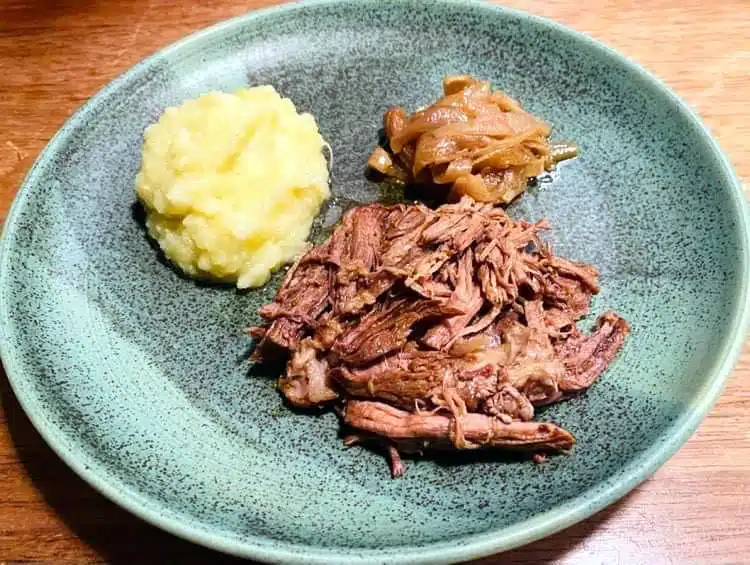 Mere om pulled beef med rodfrugtmos og lækre løg